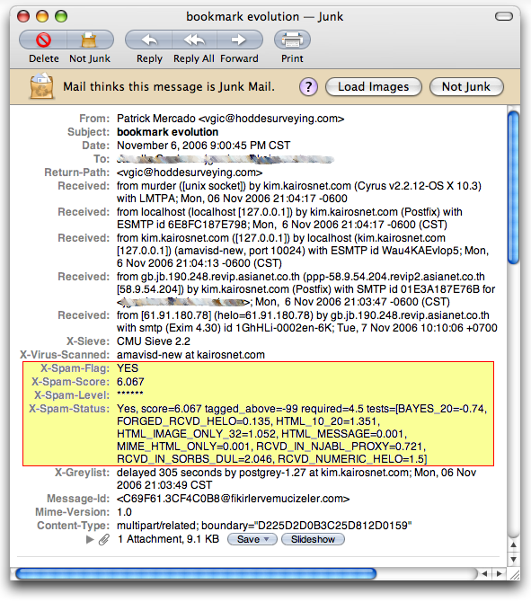Emails with high spam scores are automatically rejected. Emails with medium spam scores--meaning they might be spam--are tagged with a special "X-Spam-Flag: YES" header (see example below), and delivered to your inbox. That header can be used by client-side or server-side filtering to push suspected spam into a Junk folder.