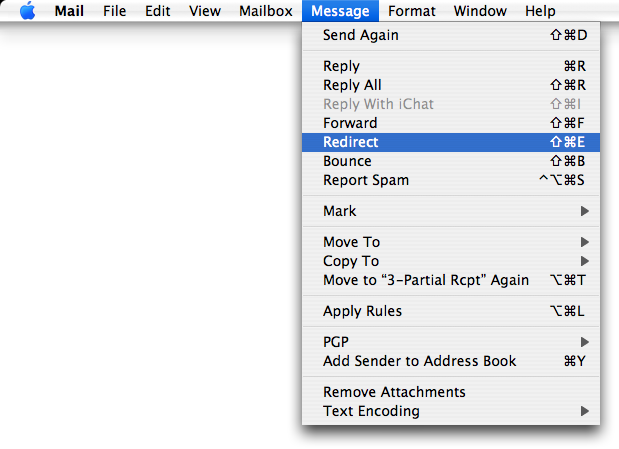 Method 2: Redirect spam to spam@brazoslink.net. Most modern email clients have a redirect feature, though its location differs between applications. For example, Mail.app in Mac OS X has a Redirect menu option in the Message menu (see below). Click here to view a page of instructions on how to redirect email in most modern email clients. It's important to redirect the message rather than forward it, so that the original message headers remain intact.