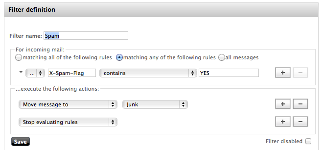 To create a server-side filter that moves any message that has been flagged as spam into a folder called Junk, you must first enable server-side filters for your account. Once that's done, add a filter like the one shown below.